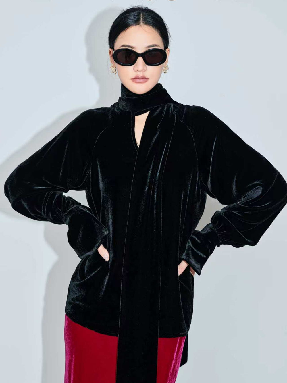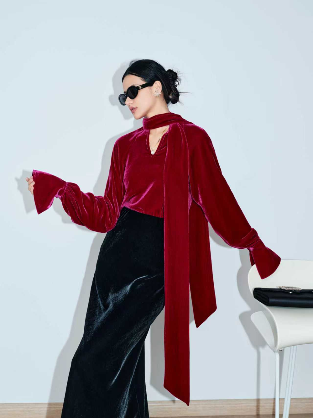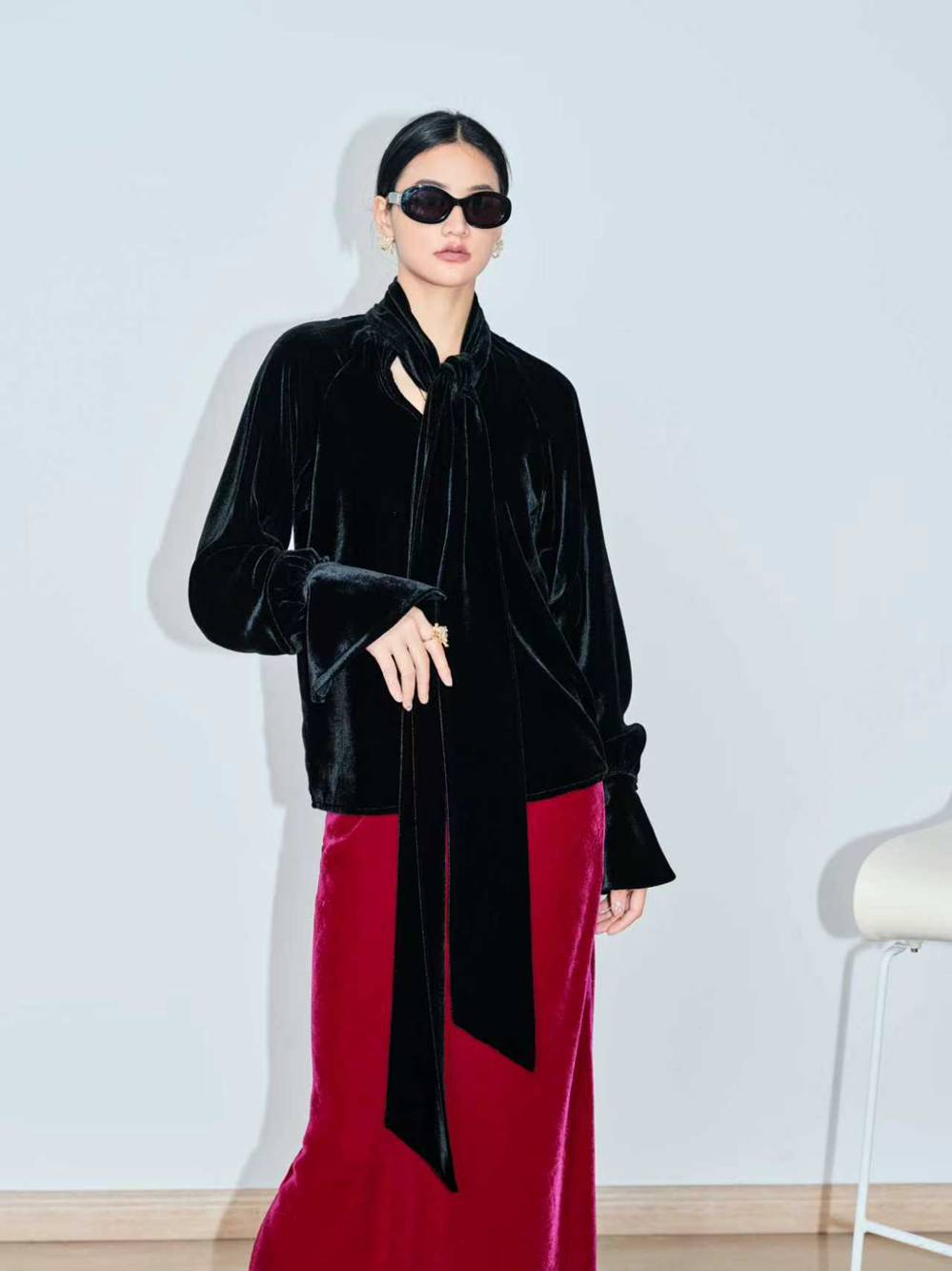 This blouse offers a captivating blend of rich texture and dramatic flair, embodying effortless high-end style. Crafted from luxurious silk velvet, it features a large, flowing neck-tie and an elegant oversized cut with voluminous sleeves that end in deep bell cuffs. It's the perfect statement piece for creating an unforgettable, confident look at any cocktail hour or evening event.