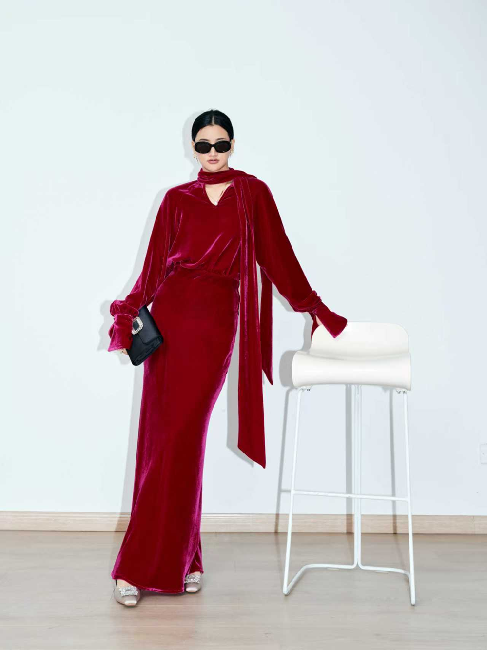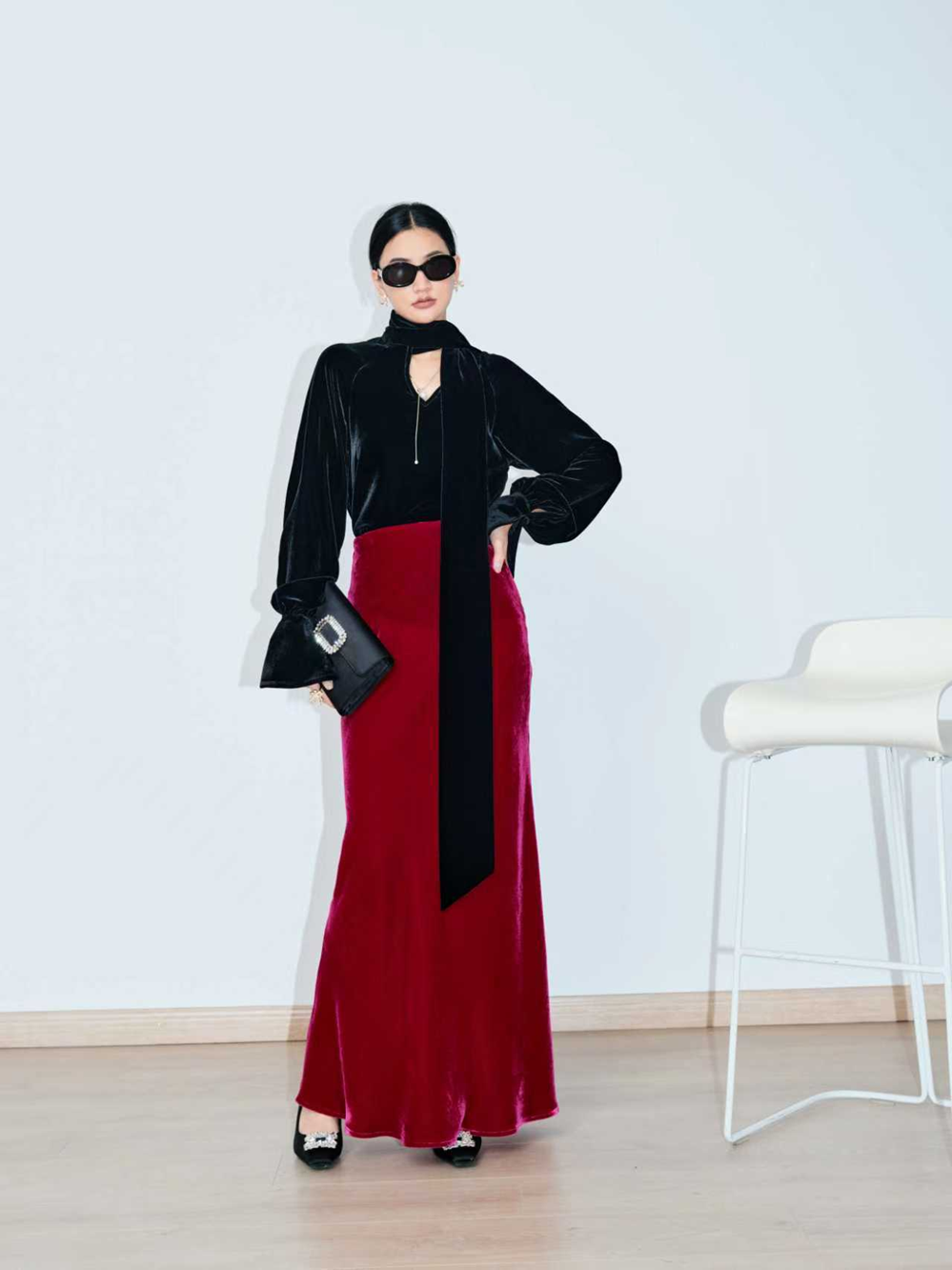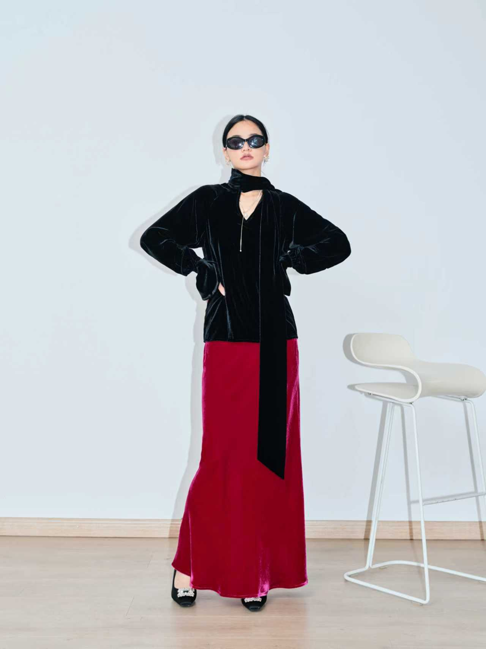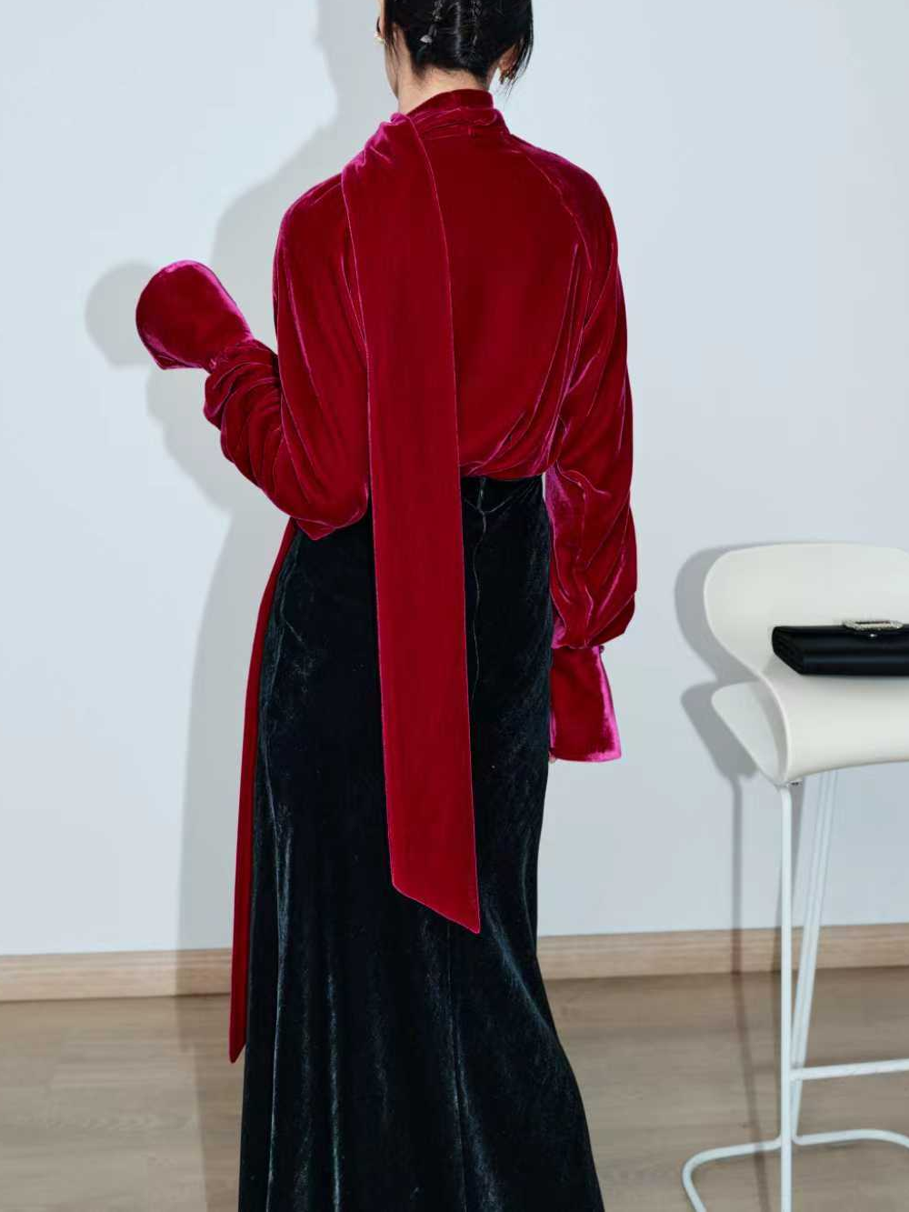 This blouse offers a captivating blend of rich texture and dramatic flair, embodying effortless high-end style. Crafted from luxurious silk velvet, it features a large, flowing neck-tie and an elegant oversized cut with voluminous sleeves that end in deep bell cuffs. It's the perfect statement piece for creating an unforgettable, confident look at any cocktail hour or evening event.