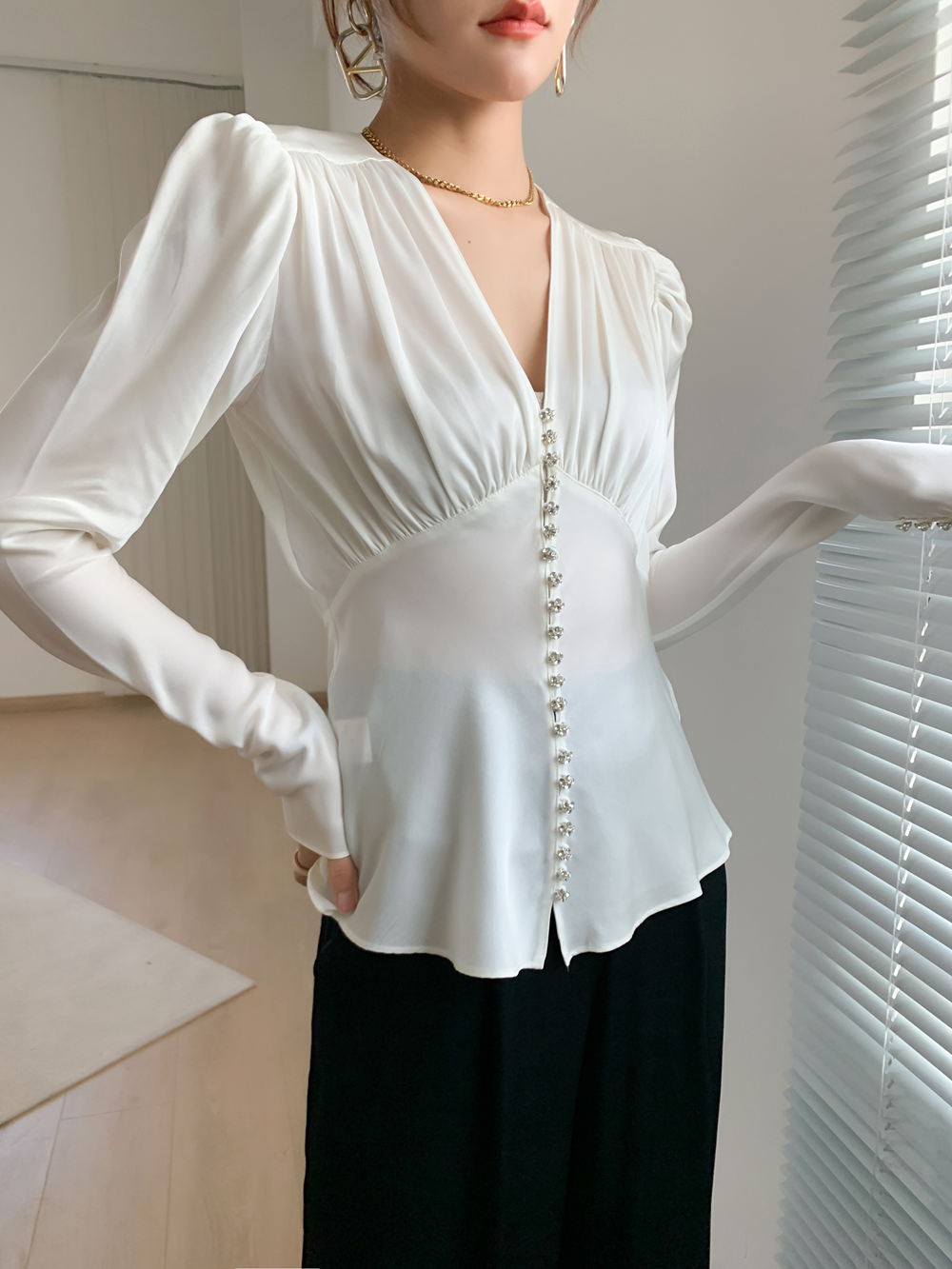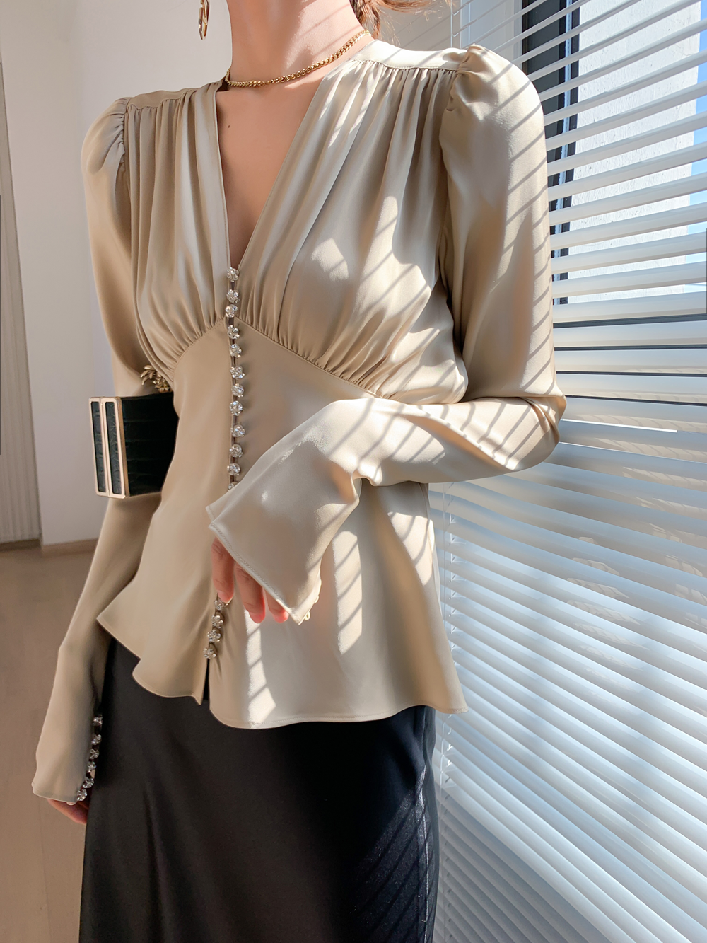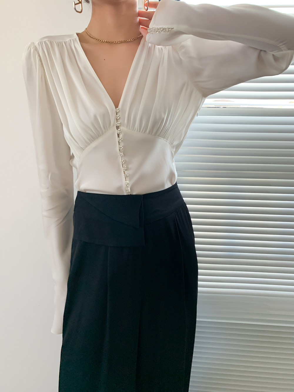 This stunning blouse offers a perfectly retro silhouette with its pleated, cinched waist design. The pleating narrows the waist from the shoulders down, while also flattering the bust, creating an effortlessly chic and elegant look. A luxurious line of 21 delicate, sparkling diamanté flowers graces the placket, drawing the eye vertically to create a longer, leaner silhouette. The sleeves are intentionally slim, with matching diamante accents on the cuffs that echo the front design, adding to the sexy yet sophisticated overall appeal. It's crafted from premium and heavy-weight silk for a soft, barely-there feel on the skin. The fabric is incredibly smooth, soft and drapes beautifully, offering a superior feel and texture that sets it apart from ordinary silk.