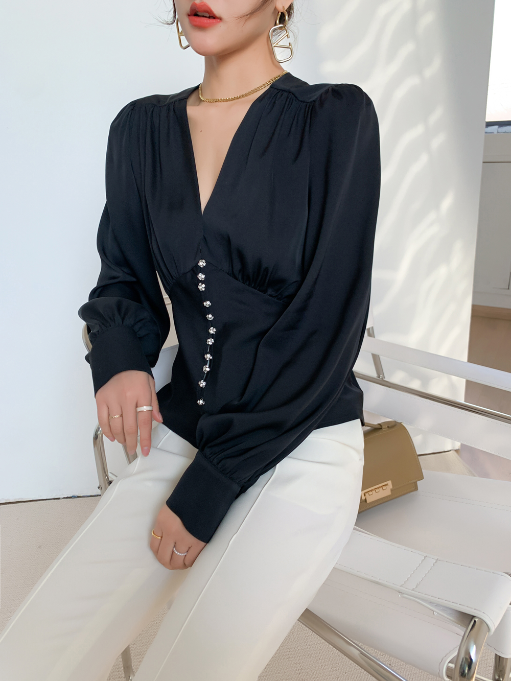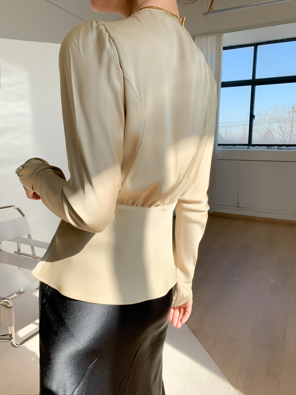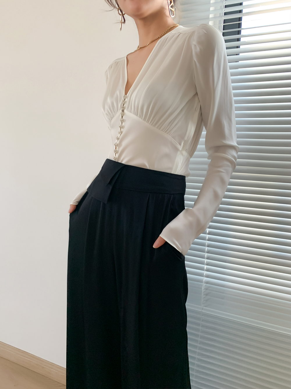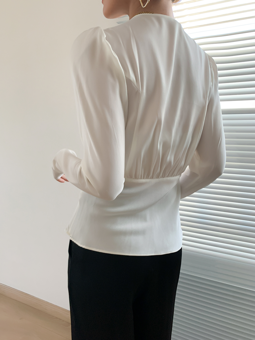 This stunning blouse offers a perfectly retro silhouette with its pleated, cinched waist design. The pleating narrows the waist from the shoulders down, while also flattering the bust, creating an effortlessly chic and elegant look. A luxurious line of 21 delicate, sparkling diamanté flowers graces the placket, drawing the eye vertically to create a longer, leaner silhouette. The sleeves are intentionally slim, with matching diamante accents on the cuffs that echo the front design, adding to the sexy yet sophisticated overall appeal. It's crafted from premium and heavy-weight silk for a soft, barely-there feel on the skin. The fabric is incredibly smooth, soft and drapes beautifully, offering a superior feel and texture that sets it apart from ordinary silk.